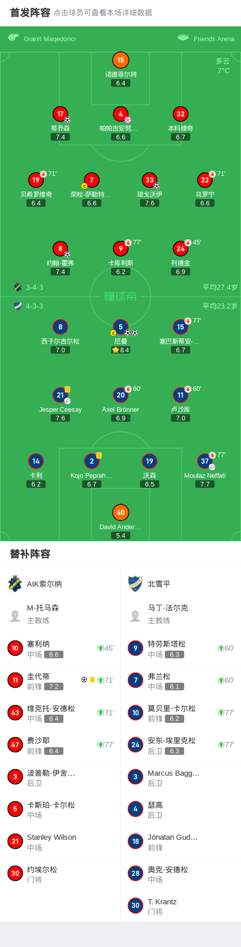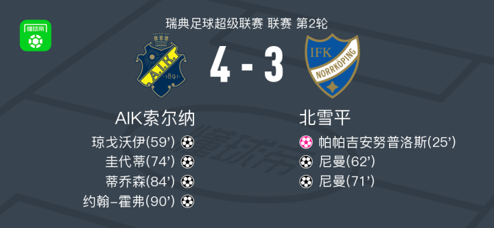 瑞典足球超级联赛第2轮,AIK索尔纳主场迎战北雪平。比赛中,AIK索尔纳的帕帕吉安努普洛斯不慎将球送入自家球门,但琼戈沃伊迅速为球队扳平比分。随后,北雪平的尼曼连入两球,帮助球队取得领先。然而AIK索尔纳并未放弃,圭代蒂、蒂乔森和约翰-霍弗接连进球完成逆转。最终,AIK索尔纳以4-3战胜北雪平。