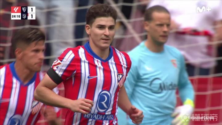 西甲第30轮客场挑战塞维利亚的比赛中,胡利安-阿尔瓦雷斯主罚点球破门帮助马德里竞技将比分扳为1-1。