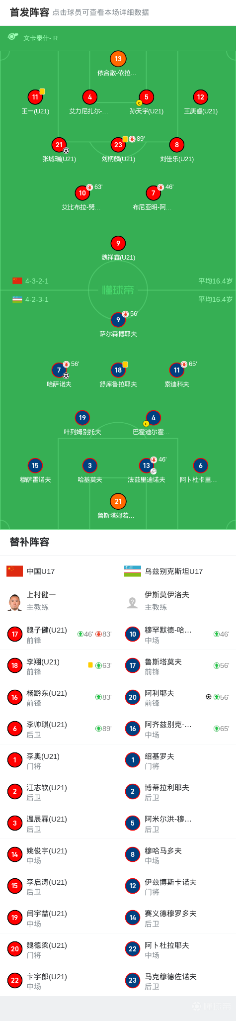 第46分钟,中国U17半场换人调整,魏子健换下布尼亚明