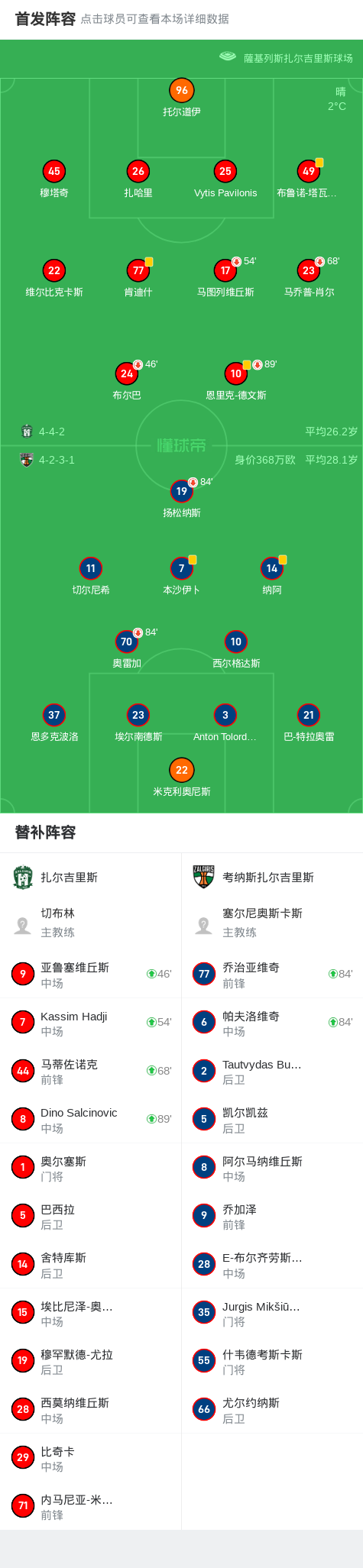 扎尔吉里斯0-0考纳斯扎尔吉里斯,势均力敌战报bot @懂球帝2025-04-07 01:19北京时间4月6日,立陶宛足球超级联赛第5轮,扎尔吉里斯坐镇主场迎战考纳斯扎尔吉里斯。全场比赛双方均未能取得进球,最终以0-0的比分握手言和。点击查看本场比赛详细数据>>点击查看立陶超完整积分榜>> 球队阵容 技术统计 展开更多