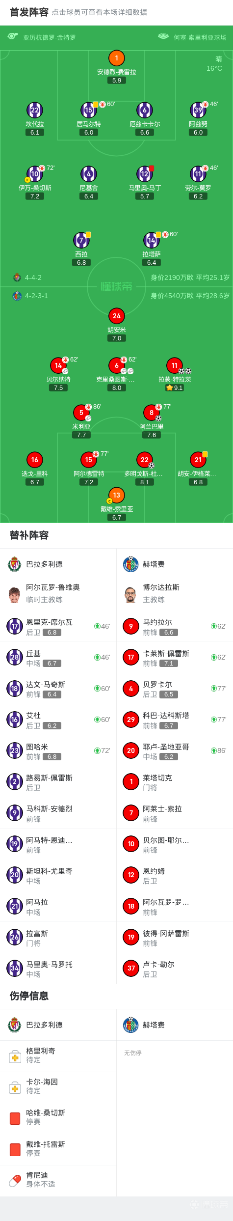 上半场补时第2分钟,巴拉多利德球队马里奥-马丁吃到红牌。