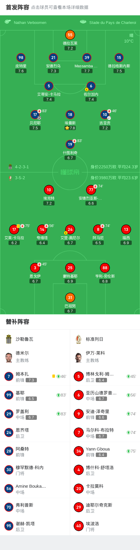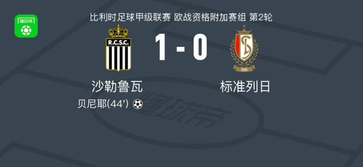 北京时间4月7日,比利时足球甲级联赛欧战资格附加赛组第2轮,沙勒鲁瓦主场迎战标准列日。比赛中,沙勒鲁瓦凭借贝尼耶的进球取得领先,最终他们以1-0战胜标准列日。