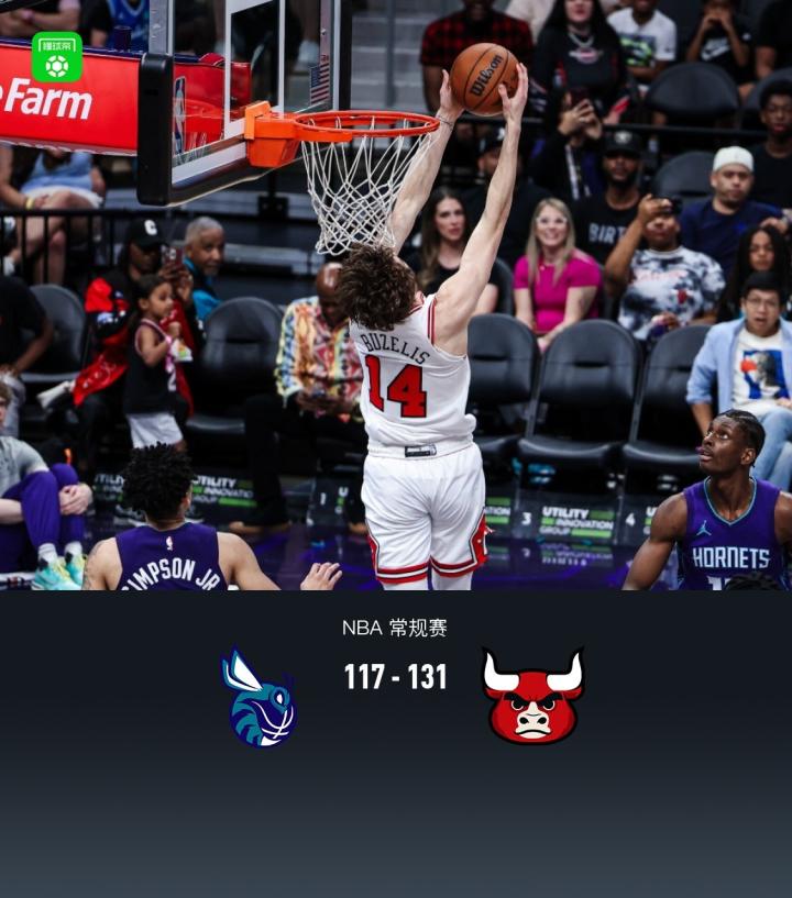 北京时间4月7日NBA常规赛,夏洛特黄蜂对阵芝加哥公牛。半场黄蜂55-75公牛,最终黄蜂117-131公牛。