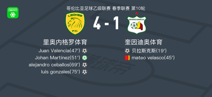 哥伦比亚足球乙级联赛春季联赛第10轮,里奥内格罗体育主场迎战奎因迪奥体育。比赛中,奎因迪奥体育由贝拉斯克斯率先打破僵局。然而,上半场结束前,奎因迪奥体育的一名队员因累计两张黄牌被罚离场。多一人作战的里奥内格罗体育迅速掌控局面,Juan Valencia很快扳平比分。随后,Johan Martínez通过点球帮助主队实现反超。比赛后半段,alejandro ceballos和luis gonzales接连建功,为主队锁定胜局。最终,里奥内格罗体育以4-1战胜奎因迪奥体育。
