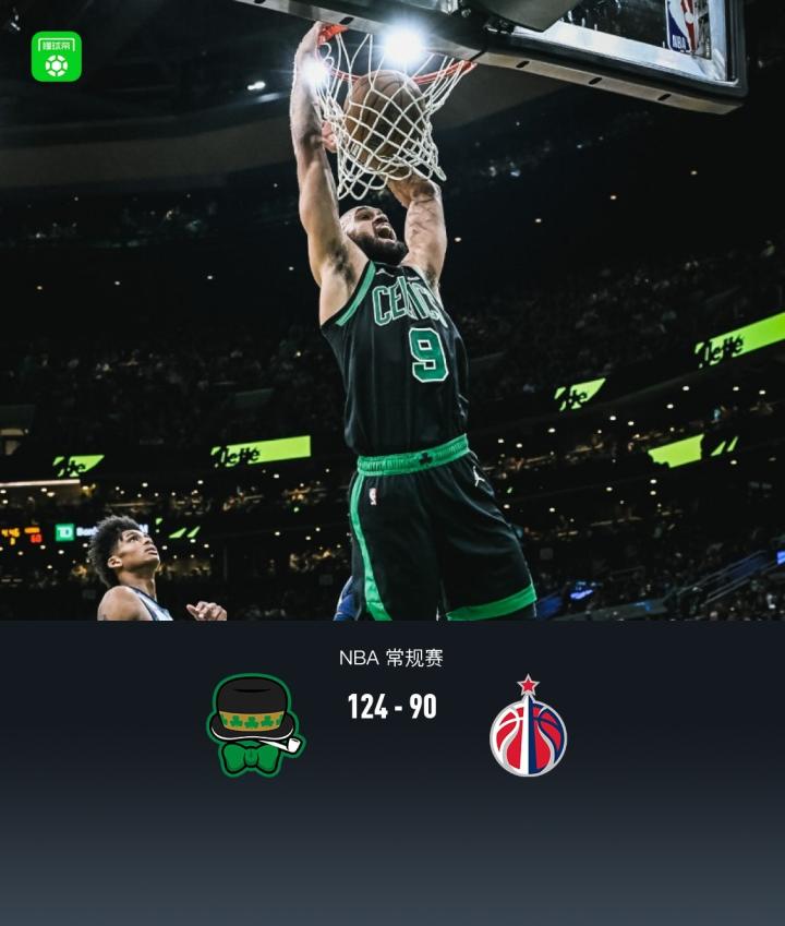 第四节凯尔特人普里查德拿下12分,奇才贾斯汀-尚帕涅拿下8分,最终凯尔特人124-90战胜奇才
