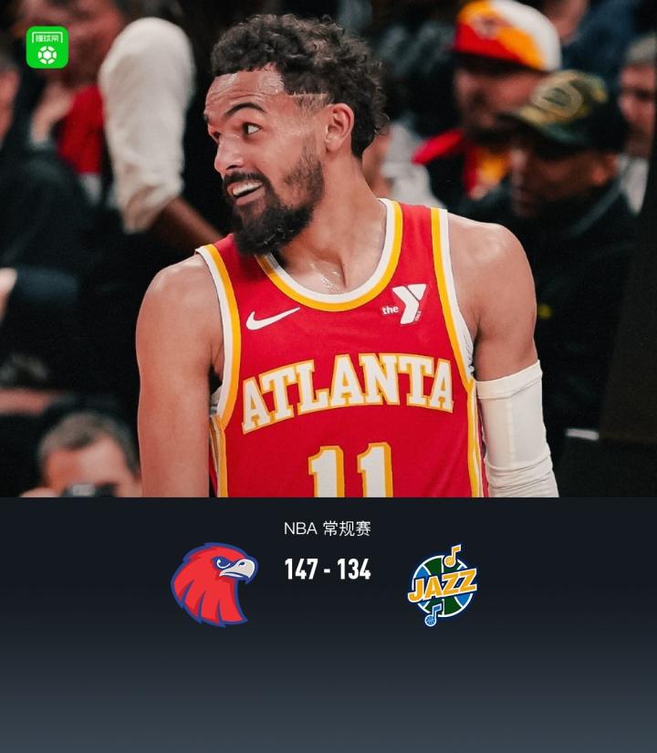 北京时间4月7日NBA常规赛,亚特兰大老鹰对阵犹他爵士。半场老鹰81-64爵士,最终老鹰147-134爵士。
