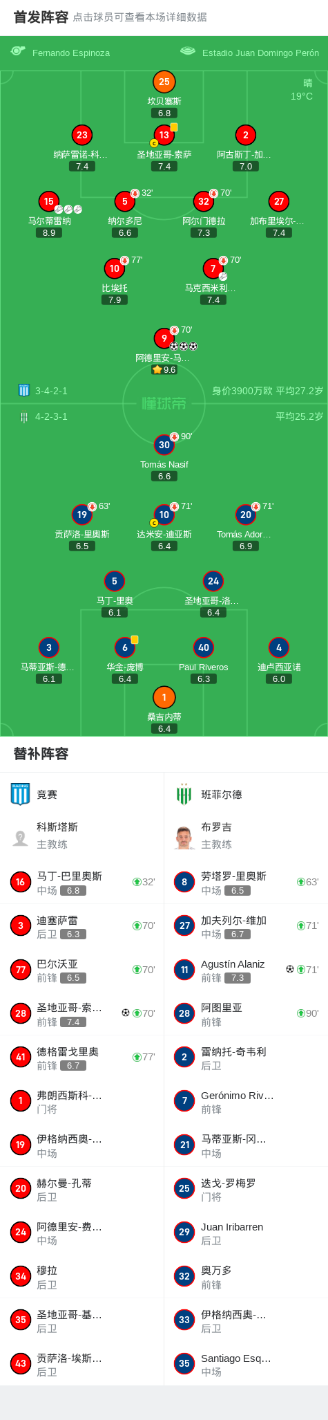 第46分钟,竞赛球员马克西米利亚诺-萨拉斯助攻阿德里安-马丁内斯打入一球。