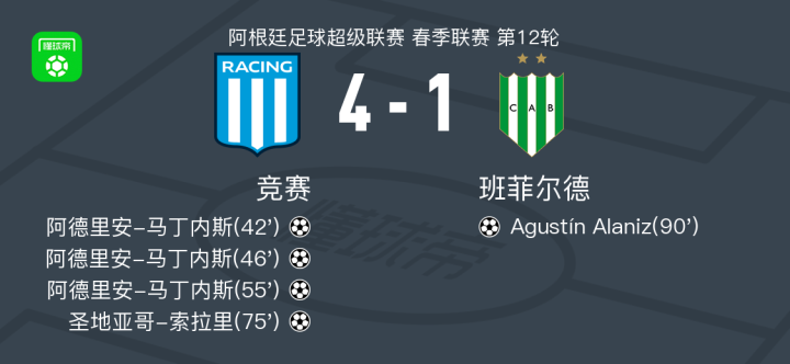 北京时间4月7日,阿根廷足球超级联赛春季联赛第12轮,竞赛主场迎战班菲尔德。本场比赛中,阿德里安-马丁内斯表现出色,完成帽子戏法,圣地亚哥-索拉里也为球队贡献一粒进球。班菲尔德方面,Agustín Alaniz在比赛尾声阶段打入一球。最终,竞赛以4-1的比分战胜班菲尔德。