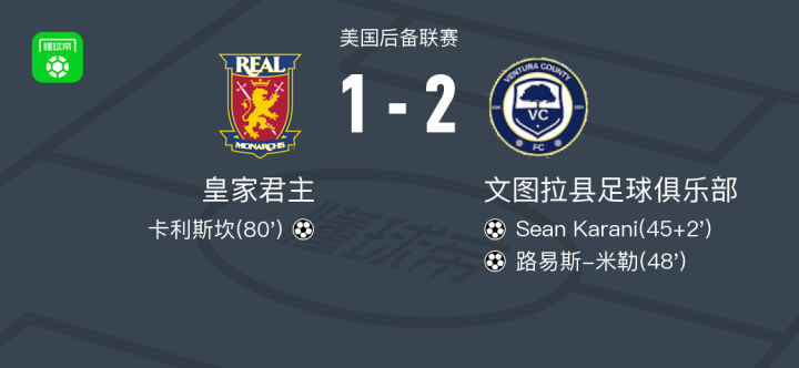 美国后备联赛中,皇家君主与文图拉县足球俱乐部展开较量。比赛中,文图拉县足球俱乐部由Sean Karani完成一次进球,并助攻路易斯-米勒再下一城。皇家君主方面,卡利斯坎成功破门扳回一球。最终,皇家君主以1-2的比分不敌文图拉县足球俱乐部。