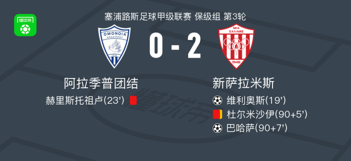 北京时间4月8日,塞浦路斯足球甲级联赛保级组第3轮,阿拉季普团结主场迎战新萨拉米斯。比赛中,新萨拉米斯由维利奥斯率先打破僵局,随后阿拉季普团结的赫里斯托祖卢因严重犯规被红牌罚下。比赛尾声阶段,新萨拉米斯的杜尔米沙伊累计两张黄牌离场,但巴哈萨在最后时刻再入一球锁定胜局。最终,阿拉季普团结主场0-2不敌新萨拉米斯。