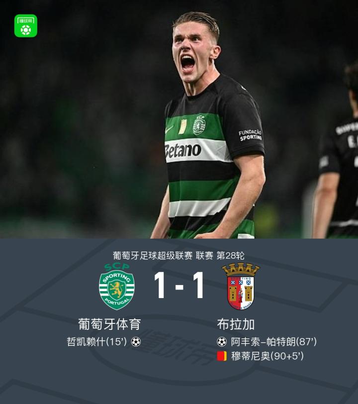 葡萄牙体育1-1布拉加,哲凯赖什任意球破门,帕特朗扳平