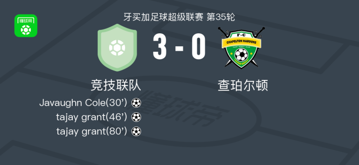 北京时间4月8日,牙买加足球超级联赛第35轮,竞技联队主场迎战查珀尔顿。比赛中,Javaughn Cole为竞技联队首开纪录,随后tajay grant独中两元,帮助球队锁定胜局。最终,竞技联队以3-0战胜查珀尔顿。