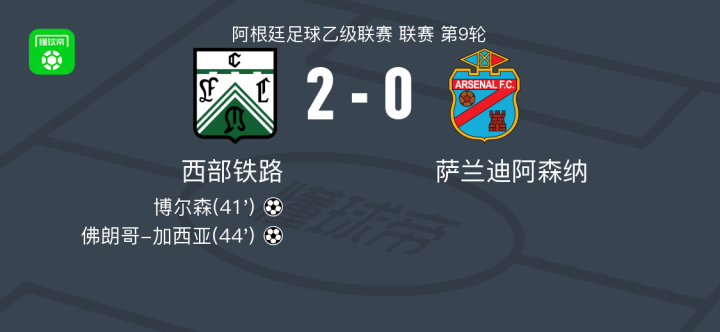 西部铁路2-0萨兰迪阿森纳,博尔森破门,佛朗哥-加西亚锁定胜局