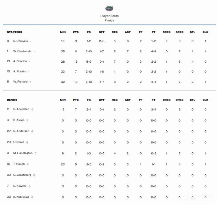 佛罗里达大学威尔·理查德18分8板2助2断1帽,亚历克斯·康登12分7板4断,小沃尔特·克莱顿11分5板7助1断1帽。