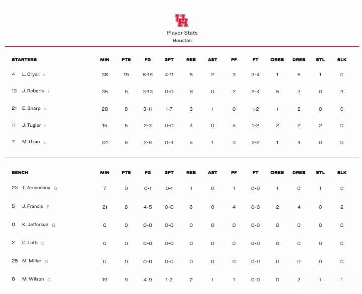 休斯敦大学奎尔19分6板2助1断,麦利克·威尔逊9分2板1助1断1帽,詹·罗伯茨8分8板3帽;
