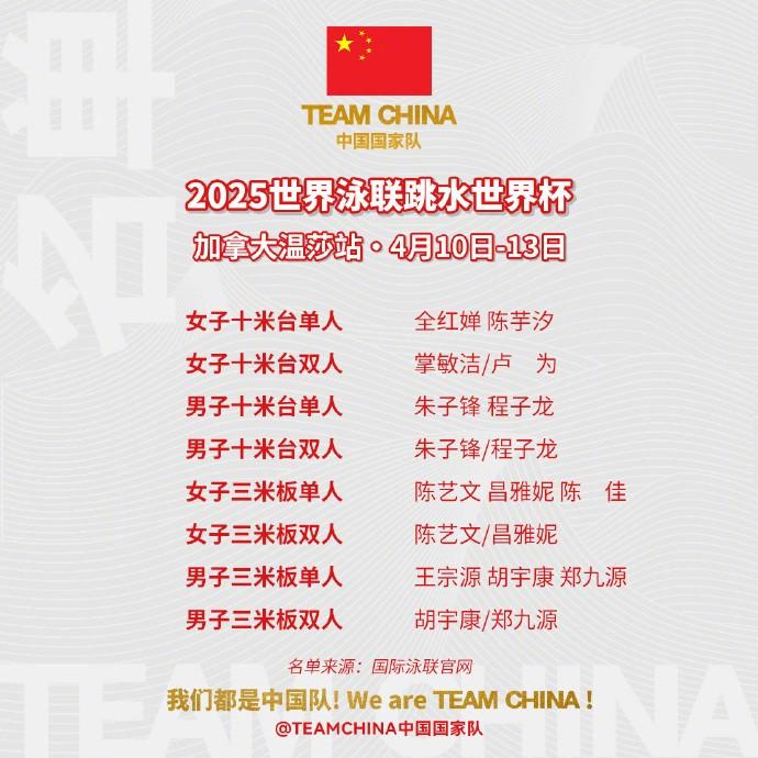 4月8日,根据国际泳联公布的信息,2025年跳水世界杯加拿大站将于4月10日至13日举行。中国队公布名单,全红婵、陈芋汐领衔出战。