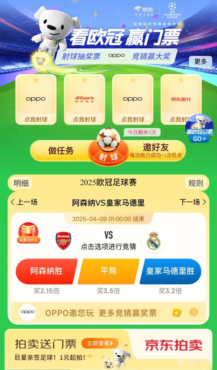 近日,京东APP“京东拍卖”频道完成升级,整合了多种拍卖形式以满足用户需求,您可以在这里参与资产竞拍、豪车捡漏、日用商品拍卖等活动。同时,上京东APP搜索“欧冠大奖”,参与本届欧冠比赛竞猜互动,也有机会赢取欧冠决赛门票和京东旅行机酒大礼包,以及红包、京豆、外卖券等多重福利。