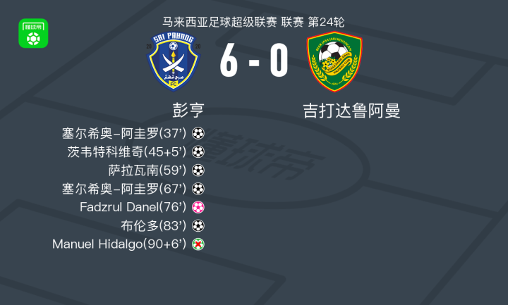 彭亨6-0横扫吉打达鲁阿曼,塞尔希奥-阿圭罗梅开二度,布伦多建功