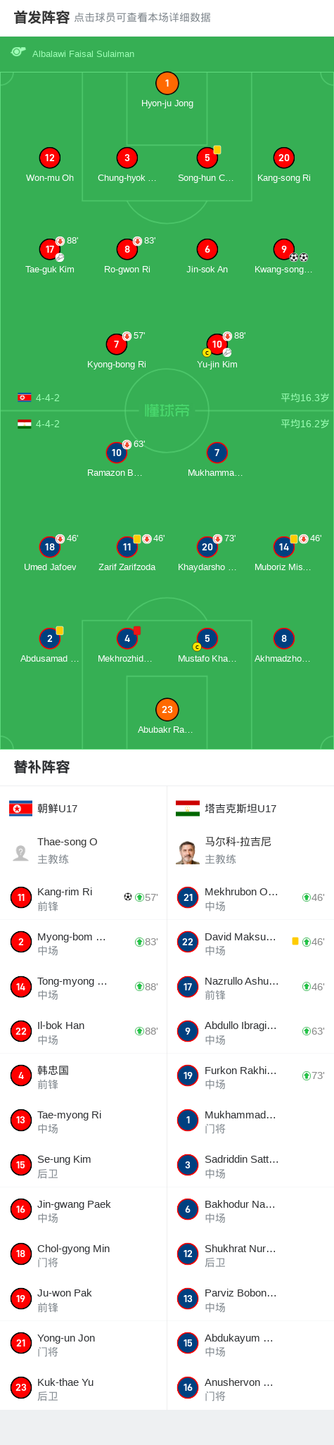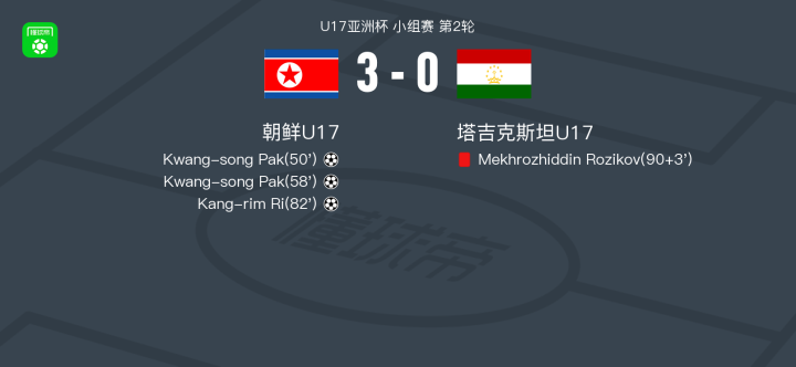 U17亚洲杯小组赛第二轮,朝鲜U17与塔吉克斯坦U17展开较量。比赛中,Kwang-song Pak表现出色完成梅开二度,Kang-rim Ri也打入一球为球队锦上添花。此外,在比赛尾声阶段,塔吉克斯坦U17的Mekhrozhiddin Rozikov因严重犯规被出示红牌罚下。最终,朝鲜U17以3-0战胜塔吉克斯坦U17。