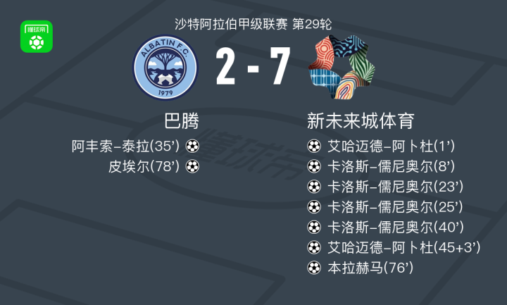 在北京时间4月8日进行的沙特阿拉伯甲级联赛第29轮比赛中,巴腾主场迎战新未来城体育。比赛中,新未来城体育展现出强大攻击力,艾哈迈德-阿卜杜梅开二度,卡洛斯-儒尼奥尔完成大四喜,本拉赫马锦上添花。巴腾方面,阿丰索-泰拉和皮埃尔各入一球。最终,巴腾以2-7不敌新未来城体育。