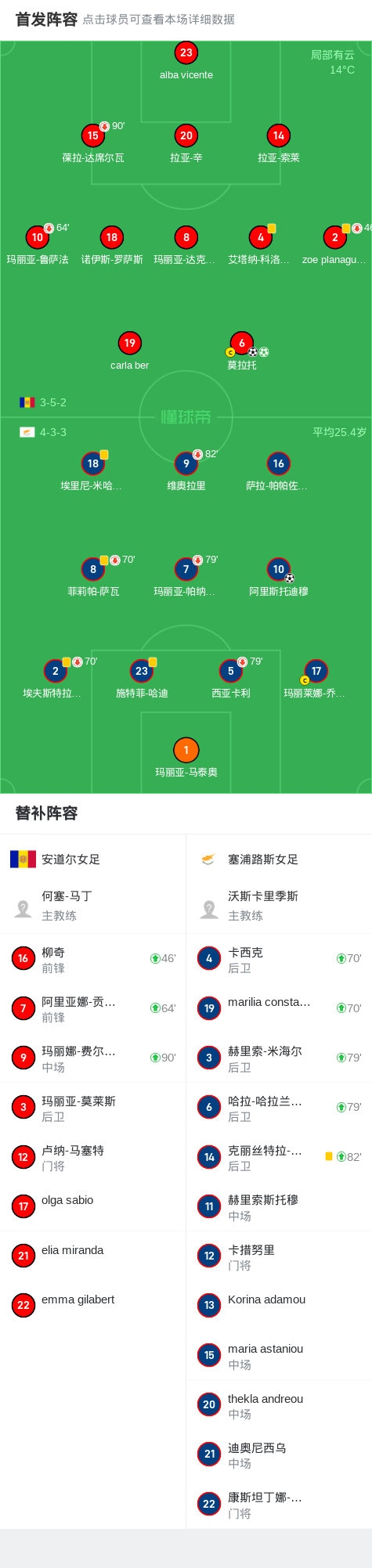 欧女国联C级联赛第4轮,安道尔女足与塞浦路斯女足展开较量。比赛中,塞浦路斯女足由阿里斯托迪穆率先建功,为球队取得领先。随后,安道尔女足发起反击,莫拉托连入两球完成逆转,其中包括一粒点球。最终,安道尔女足以2-1战胜塞浦路斯女足。