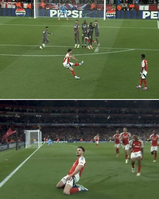 欧冠1/4决赛首回合,阿森纳主场对阵皇家马德里,下半场赖斯直接任意球破门,成为自贝克汉姆以来,首位在欧冠对阵皇马任意球破门的英格兰球员。
