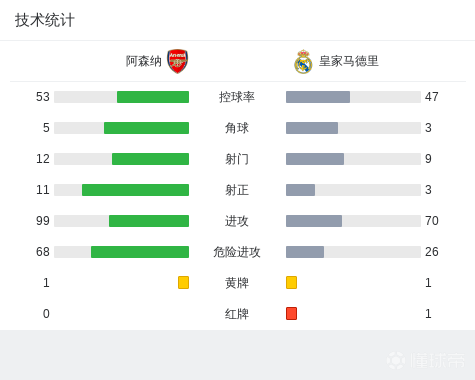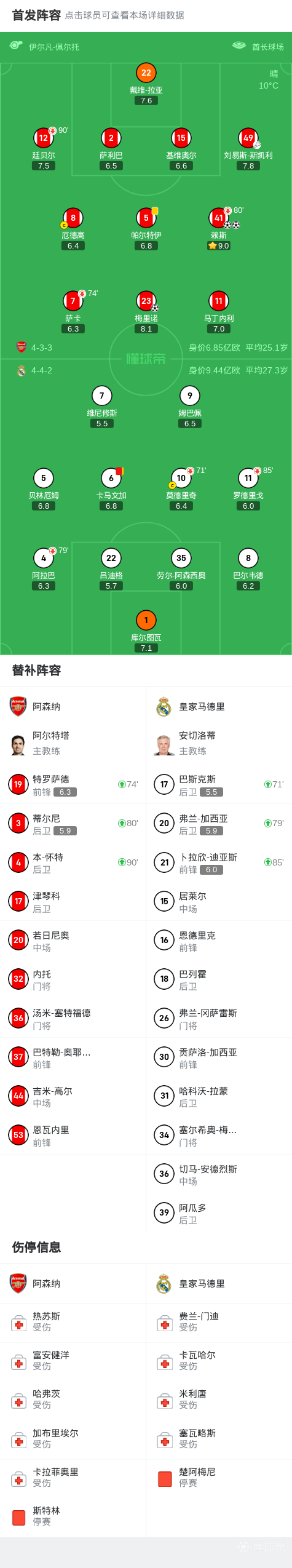 北京时间4月9日欧洲冠军联赛 1/4决赛首回合,阿森纳对阵皇家马德里。上半场帕尔特伊远射被扑,姆巴佩单刀打高,随后姆巴佩打门被拉亚扑出,赖斯和马丁内利打门被库尔图瓦神勇扑出,下半场赖斯神级任意球破门,库尔图瓦屡次扑救救险,赖斯天外飞仙任意球梅开二度,梅里诺兜射死角锁定胜局,卡马文加两黄变一红被罚下。最终比分阿森纳 3-0 皇马。