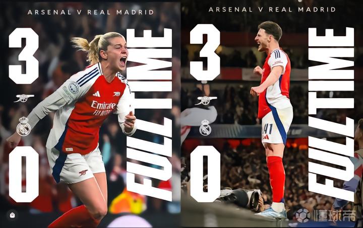 欧冠1/4决赛首回合,阿森纳主场3-0大胜皇家马德里,阿森纳男、女足两周内以同样3-0的比分击败了皇马男、女足。