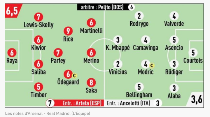 消息来源:https://www.lequipe.fr/Football/Article/Les-notes-d-arsenal-real-madrid-rice-comme-dans-un-reve-l-attaque-madrilene-en-plein-cauchemar/1552788