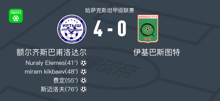 额尔齐斯巴甫洛达尔4-0大胜伊基巴斯图特,斯迈洛夫破门,费定建功