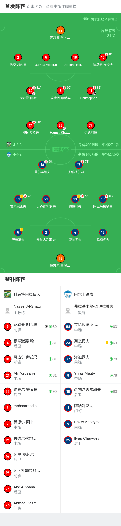 下半场补时第5分钟,科威特阿拉伯人球员Hamza Khabba助攻萨勒曼-阿瓦迪打入一球。
