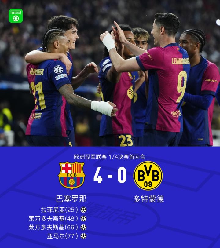 北京时间4月10日,欧洲冠军联赛1/4决赛首回合,巴塞罗那对阵多特蒙德。上半场亚马尔禁区内切打门被扑,莱万抽射被扑,拉菲尼亚铲射破门,下半场莱万头球扩大比分,费尔明击中立柱,莱万禁区抽射梅开二度,亚马尔捅射破门锁定胜局,拜尔破门被吹越位。最终,巴塞罗那以4-0的比分战胜多特蒙德。
