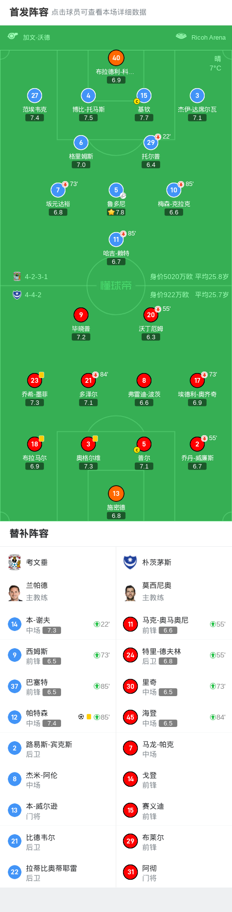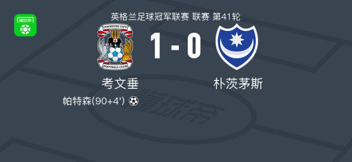 考文垂1-0朴茨茅斯,帕特森打进全场唯一进球战报bot @懂球帝2025-04-10 04:55北京时间4月10日英格兰足球冠军联赛 联赛 第41轮,考文垂主场对阵朴茨茅斯。考文垂帕特森破门。最终比分考文垂 1-0 朴茨茅斯。点击查看本场比赛详细数据>>点击查看英冠完整积分榜>>精彩瞬间下半场补时第4分钟,考文垂球员鲁多尼助攻帕特森打入一球。 球队阵容 技术统计 展开更多
