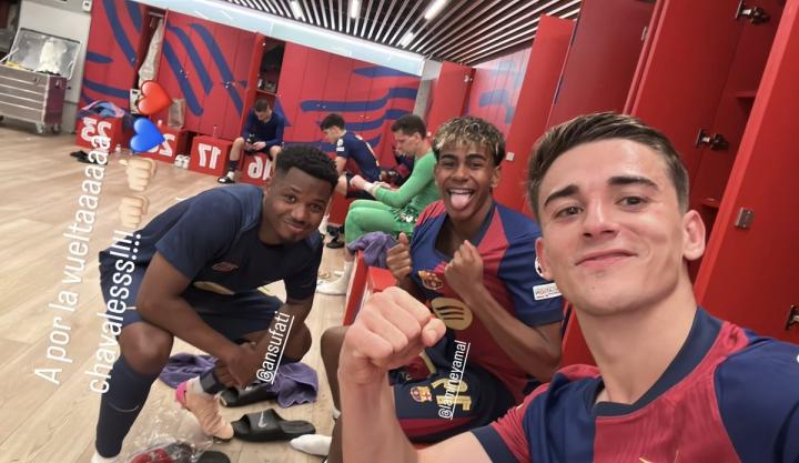 庆祝欧冠大胜,加维晒赛后更衣室与亚马尔、法蒂合照