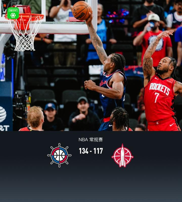 第四节快船博格丹拿下11分,火箭杰夫-格林拿下11分,最终快船134-117战胜火箭