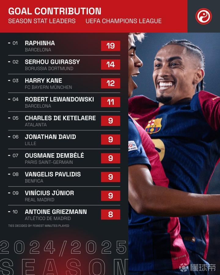 本赛季欧冠直接参与进球榜:拉菲尼亚、吉拉西、凯恩前三