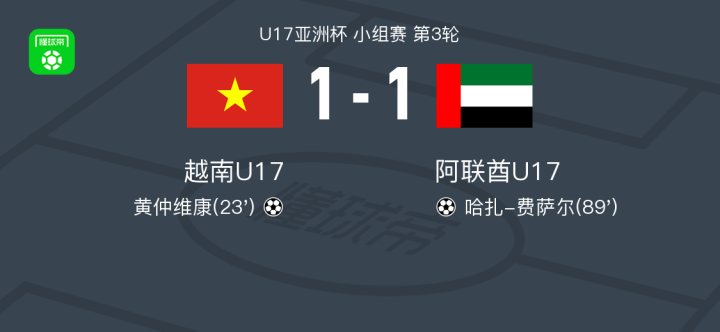越南U17 1-1阿联酋U17,黄仲维康破僵,哈扎-费萨尔救主