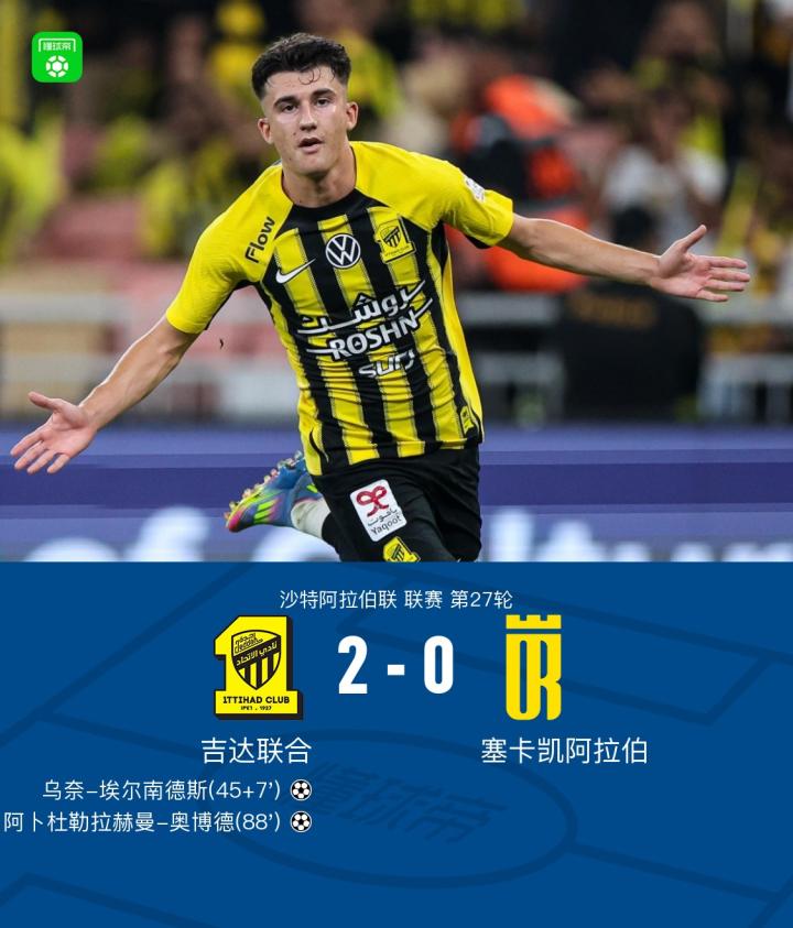 吉达联合2-0塞卡凯阿拉伯,乌奈-埃尔南德斯、奥博德建功
