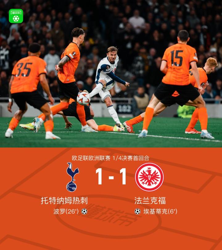 欧足联欧洲联赛1/4决赛首回合,托特纳姆热刺对阵法兰克福。比赛中,法兰克福由埃基蒂克率先打破僵局,而托特纳姆热刺则依靠波罗的进球扳平比分。最终,双方以1-1战平。
