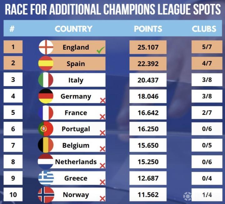 据Foot Rankings消息,德国已确定无缘下赛季欧冠第五个席位名额的争夺。这两个额外席位几乎将确定由英格兰(已经锁定)与西班牙(几乎锁定)获得。