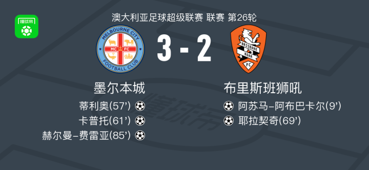 北京时间4月11日澳大利亚足球超级联赛 联赛 第26轮,墨尔本城主场对阵布里斯班狮吼。墨尔本城蒂利奥破门,卡普托破门,赫尔曼-费雷亚破门。布里斯班狮吼阿苏马-阿布巴卡尔破门,耶拉契奇破门。最终比分墨尔本城 3-2 布里斯班狮吼。