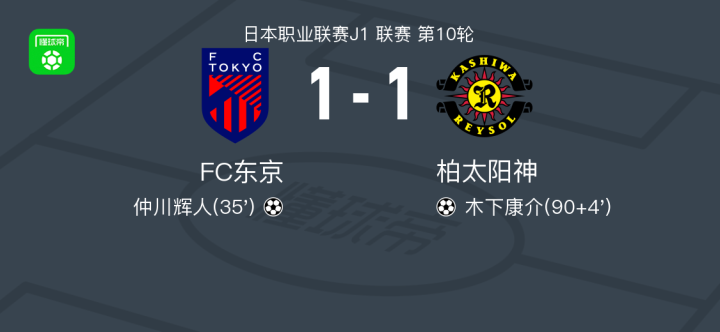 北京时间4月11日,日本职业联赛J1联赛第10轮,FC东京主场迎战柏太阳神。比赛中,FC东京由仲川辉人攻入一球取得领先。柏太阳神则在比赛尾声由木下康介扳平比分。最终,双方以1-1的比分握手言和。