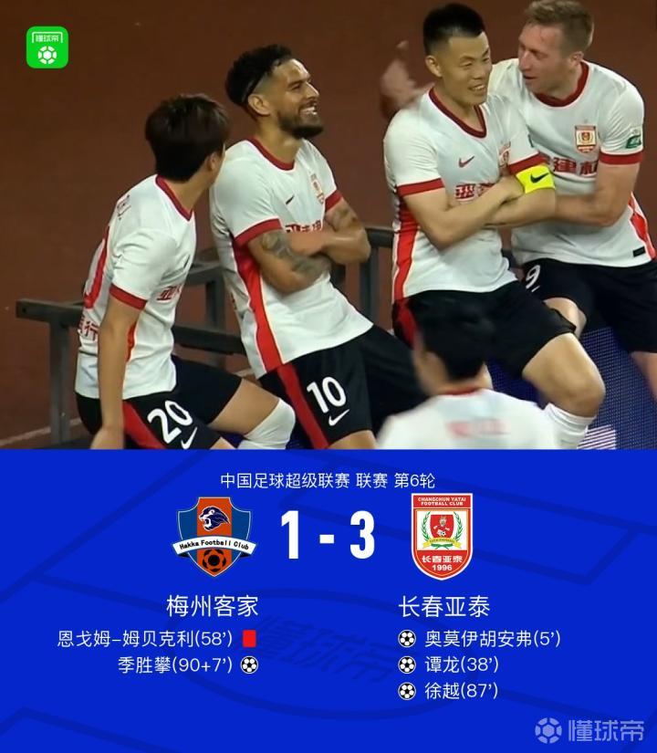 北京时间4月11日,中国足球超级联赛第6轮,梅州客家主场迎战长春亚泰。比赛中,长春亚泰由奥莫伊胡安弗首开纪录,并通过团队配合由谭龙破门将比分扩大,徐越吊射再进一球。随后,梅州客家在场上少一人的情况下顽强作战,最终由季胜攀扳回一球。最终,十人梅州客家1-3不敌长春亚泰。