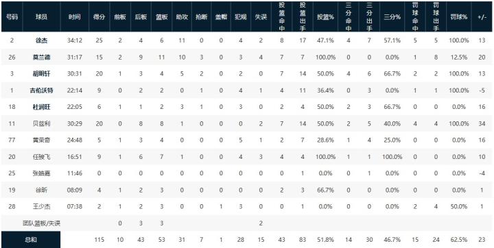 第四节,开节段上海继续依靠洛夫顿强杀内线得分,广东给予回应继续保持20分以上领先,广东胡明轩。徐杰、贝兹利连续个人表现秀,上海李添荣、偰李永炜相继三分无济于事,最终广东115-92战胜上海。
