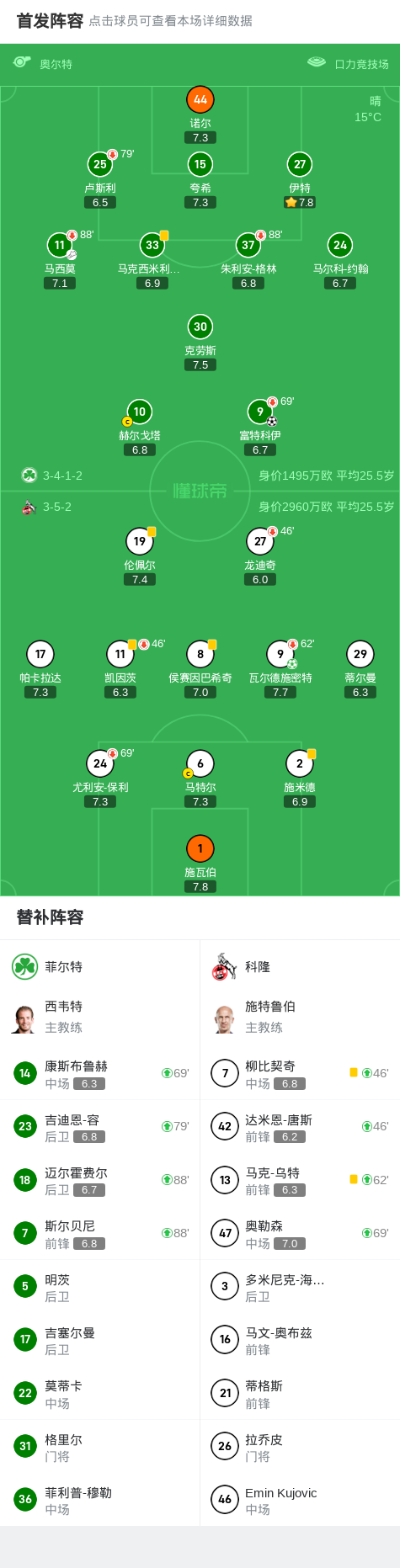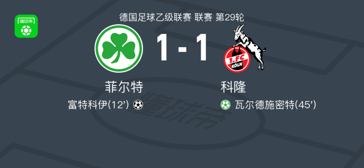 菲尔特1-1科隆,富特科伊破门,瓦尔德施密特扳平比分
