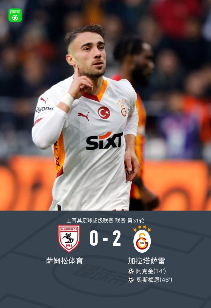 加拉塔萨雷2-0萨姆松体育,阿克金建功,奥斯梅恩锁定胜局