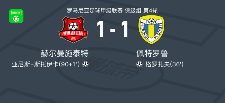 北京时间4月12日,罗马尼亚足球甲级联赛保级组第4轮,赫尔曼施泰特主场迎战佩特罗鲁。比赛中,佩特罗鲁由格罗扎夫取得进球,赫尔曼施泰特则依靠亚尼斯-斯托伊卡的进球扳平比分。最终,双方以1-1的比分结束比赛。