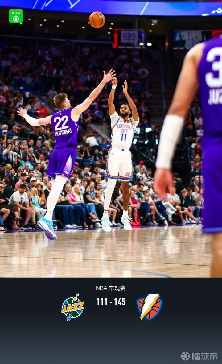 第四节爵士米凯卢克拿下11分,雷霆阿龙-威金斯拿下9分,最终爵士111-145不敌雷霆
