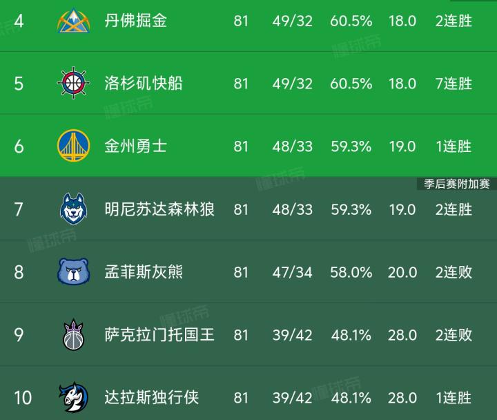 目前,掘金、快船、勇士、森林狼四队将竞争三个直接晋级季后赛的名额,灰熊队已经锁定附加赛的上半区,国王和独行侠则位居附加赛的下半区。
