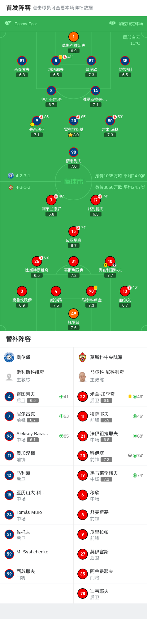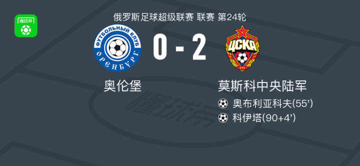俄罗斯足球超级联赛第24轮,奥伦堡主场迎战莫斯科中央陆军。比赛中,莫斯科中央陆军凭借奥布利亚科夫的关键进球取得领先,补时阶段热马莱季诺夫送出助攻,科伊塔再入一球锁定胜局。最终,莫斯科中央陆军客场2-0战胜奥伦堡加索维克。